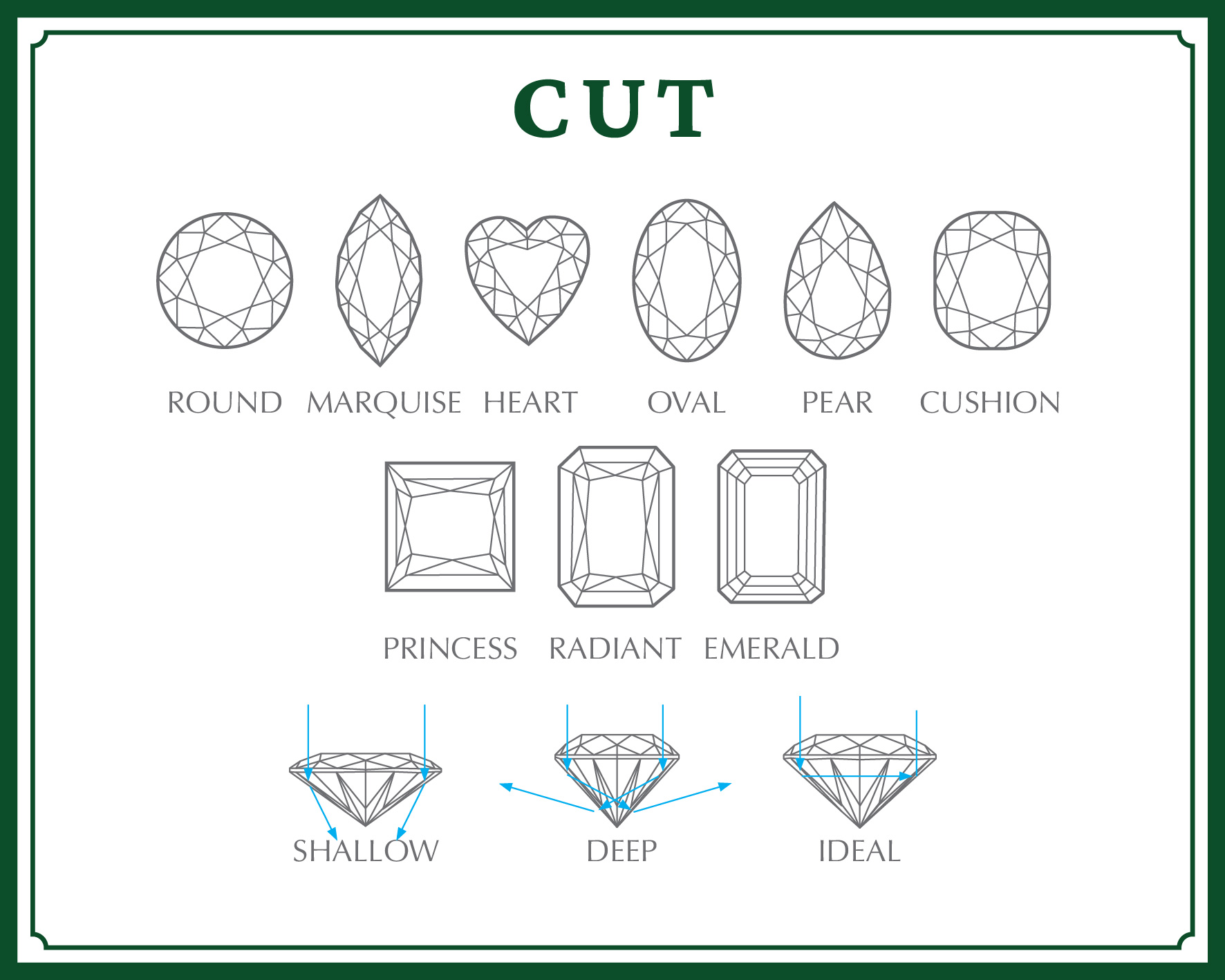 Cut atau biasa dikenal sebagai potongan berlian. Potongan berlian ini menjadi aspek yang penting karena potongan akan menentukan bagaimana berlian tersebut berinteraksi dengan cahaya dan berperan penting dalam menentukan keindahan batu. Beberapa hal yang perlu diperhatikan pada potongan berlian adalah simetri, proporsi dan polesannya. Berlian di Ciella and Co. dipotong dengan mengutamakan kecemerlangan pada perhiasannya. Jika berlian dipotong dengan buruk, berlian akan tampak kusam meskipun memiliki warna dan tingkat kejernihan tinggi. Sebaliknya jika berlian dipotong dengan baik, berlian tersebut akan memantulkan dan membiaskan cahaya dengan kilauan indah yang maksimal. Berlian moissanite kami diproduksi oleh pengrajin profesional dan ahli, yang mampu menghasilkan berlian dengan potongan yang sempurna / excellent cut.