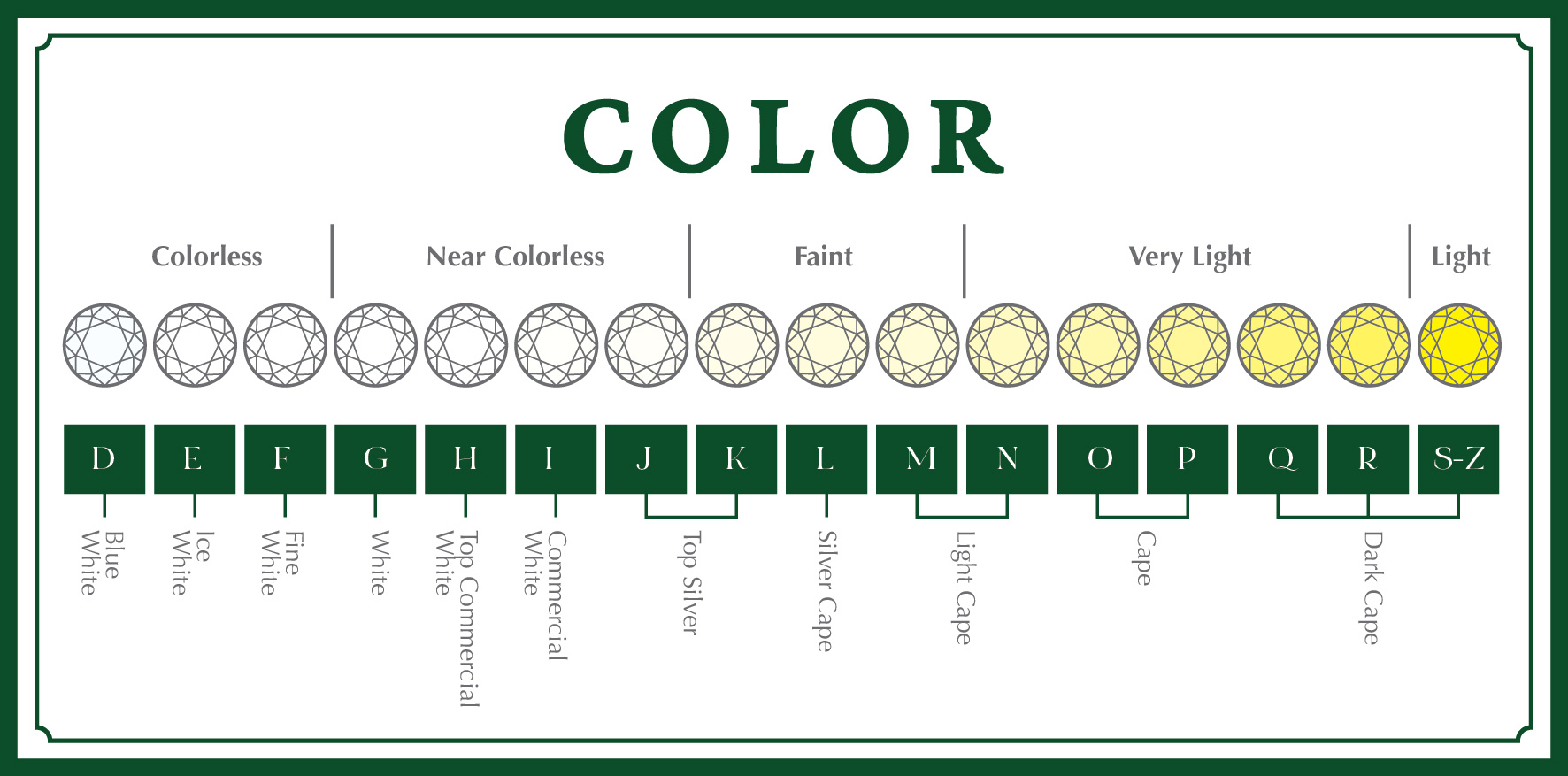 Ciella & Co. hanya memilih berlian moissanite dengan tingkat warna “tidak berwarna” dan “hampir tidak berwarna”. Ini berarti kita hanya memilih berlian dengan tingkat warna D, E, F, G, H dan I. Warna dapat mempengaruhi keindahan pada batu berlian, berlian dengan tingkat warna yang buruk dapat terlihat sedikit kuning. Ciella & Co selalu mengutamakan untuk memilih berlian dengan tingkat warna yang putih cemerlang.